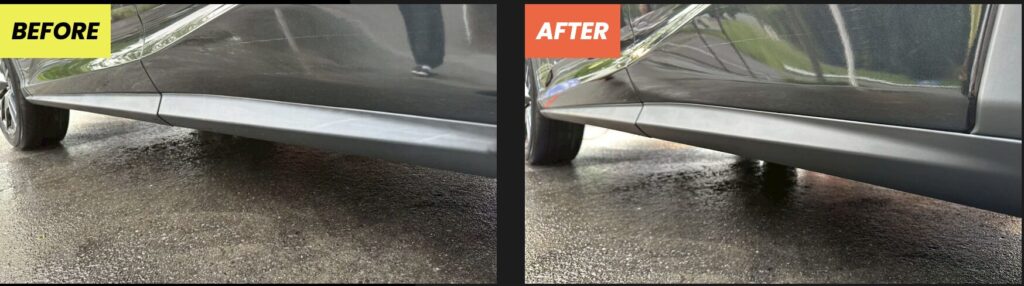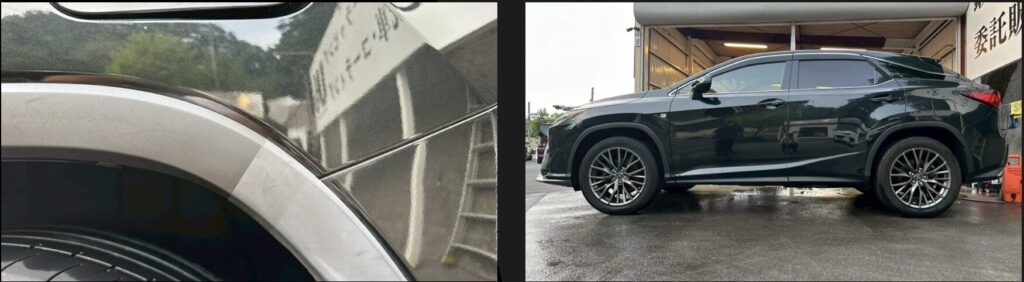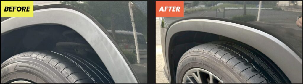 ビフォーアフターをご覧の通り、ツヤと深みのある黒さが復元され、車全体の印象もグッと引き締まります。